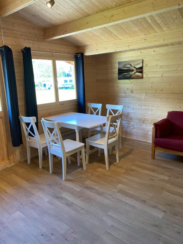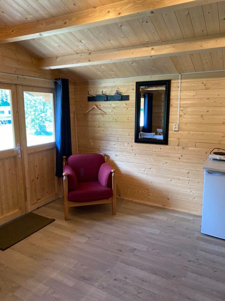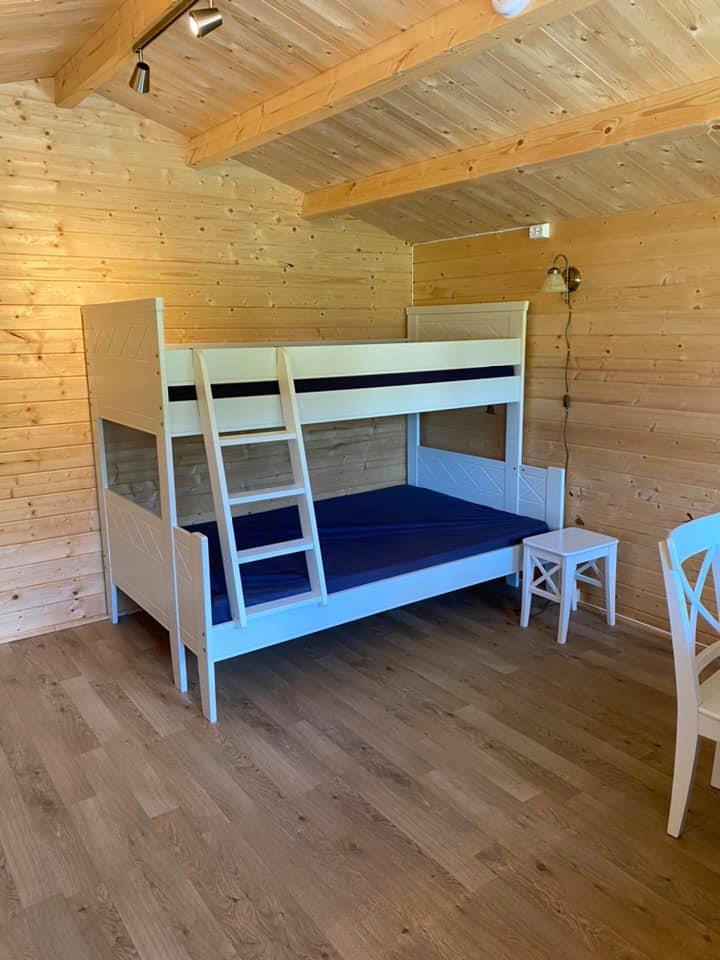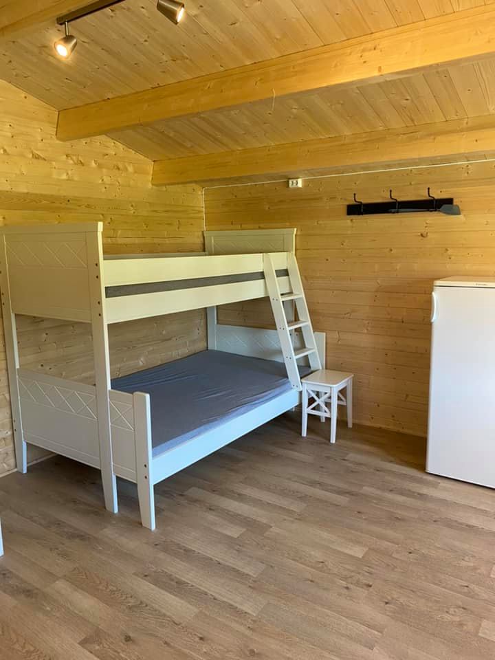 Telt, samt fem utleiehytter i forskjellig størrelser.